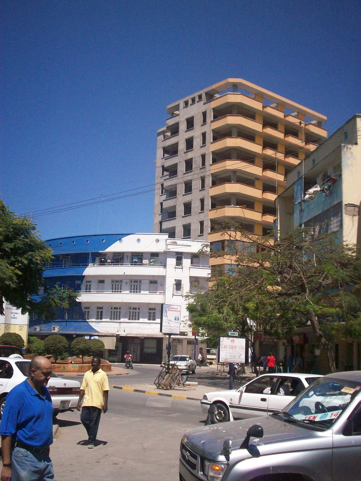Common sight in Dar. The new dwarfing the old painted with disgusting Vodacom colors.